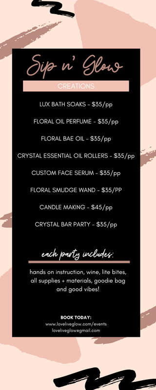 Love.Live.Glow now offers private Sip n' Glow parties in the comfort of your own home or venue of your choice. Yasss, you now can customize your glow and have a good time while doing so! You and your crew can totally relax because we provide everything you need including the vibes (wine, light bites, and tunes) all you and your guest would have to do is show up! As the host of the party you will be able to choose the activity for the evening - if you would like more than one activity, please email loveliveglow@gmail for custom quote.